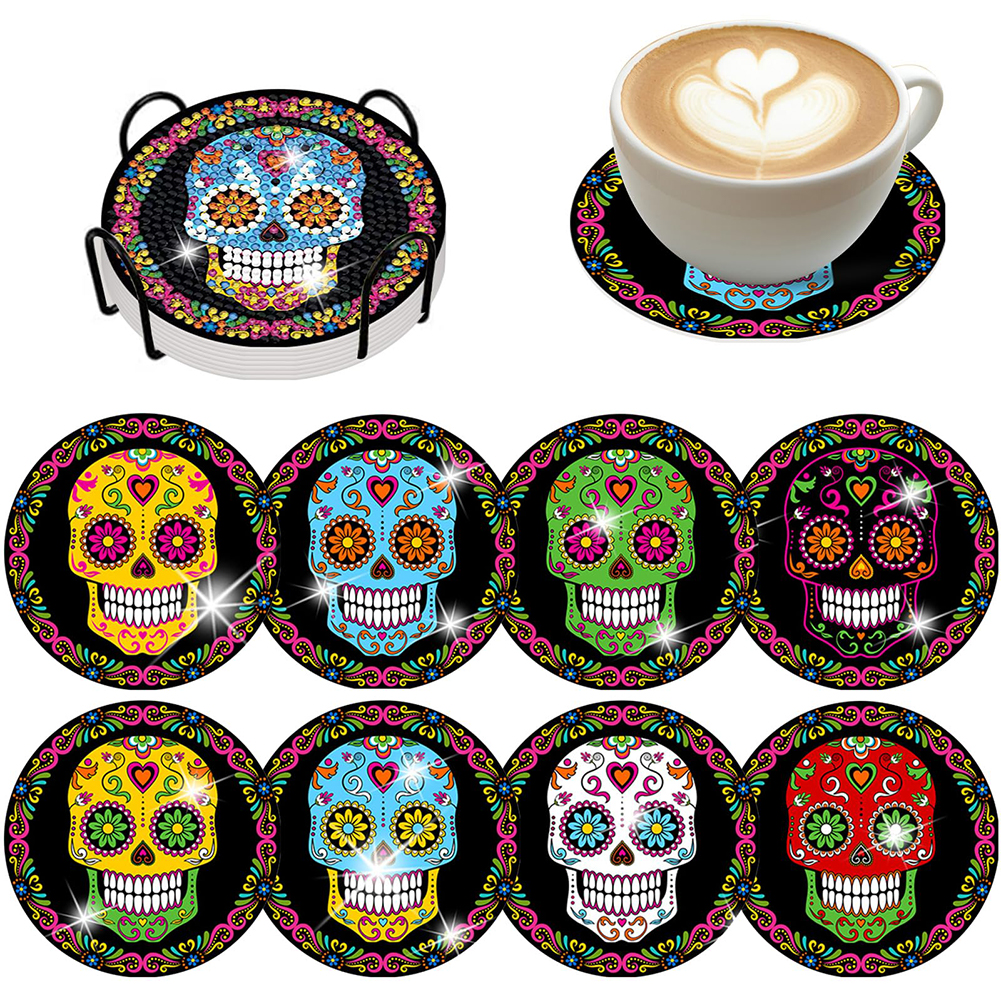 8PCS DIY Acrylic Diamond Painting Art Coaster Kit with Holder (Skull)