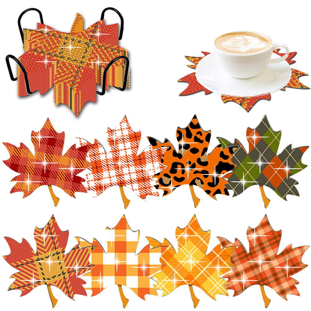8PCS DIY Acrylic Diamond Painting Art Coaster Kit with Holder(Maple Leaf)