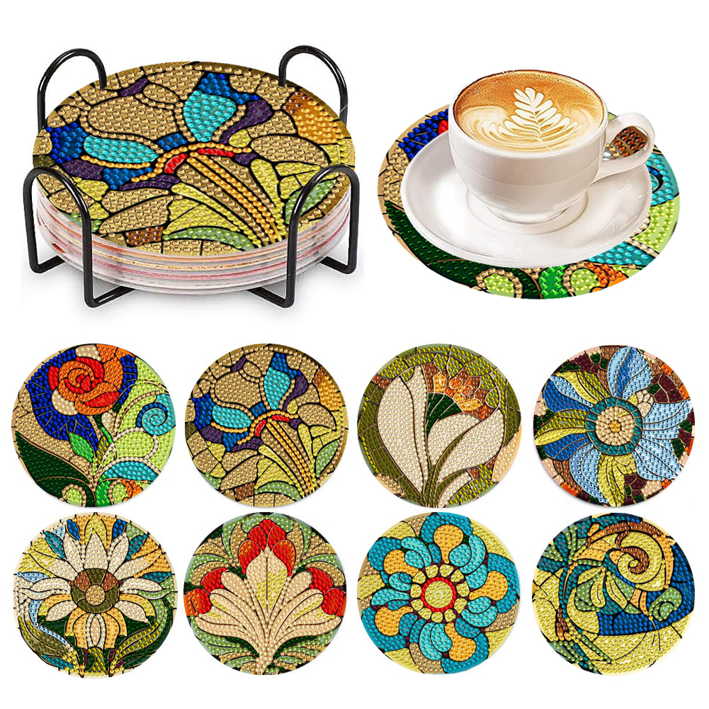 8pcs Wooden Diamond Painting Coasters Kits with Holder(Flower)