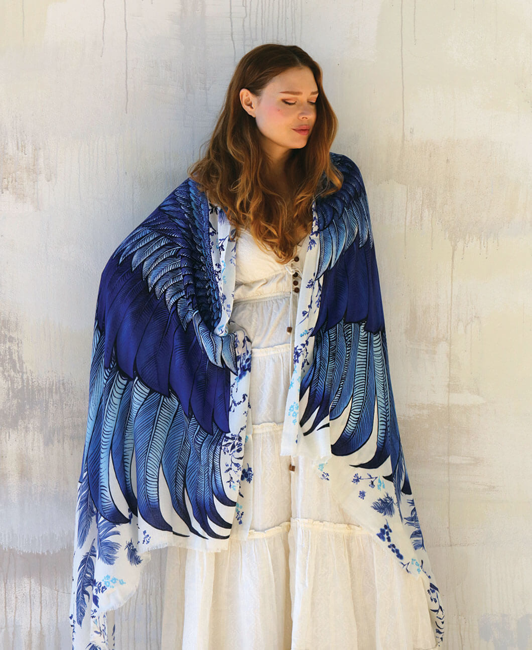 Hand painted and digitally printed Art of wide - Blue wings scarf. This highly detailed representation of nature, freedom and beauty is my labor of Love. Just put it over your shoulders to look & feel divine. This scarf would make the most amazing gift for your loved ones to treasure for years to come!
