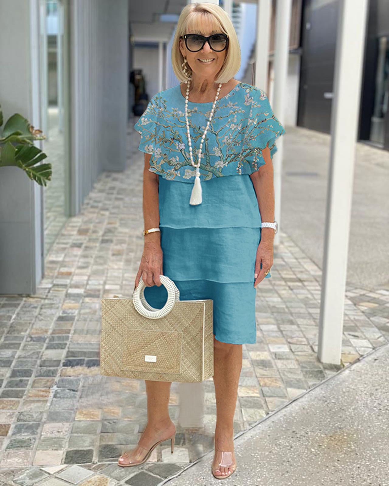 Elegant Almond Blossoms Print Tiered Dress