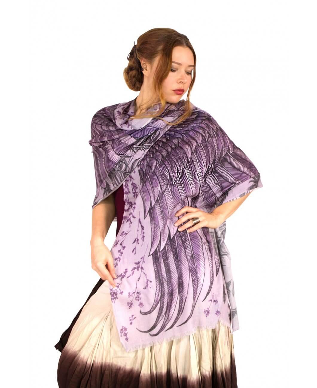 Hand painted and digitally printed Art of wide - purple wings scarf. This highly detailed representation of nature, freedom and beauty is my labor of Love. Just put it over your shoulders to look & feel divine. This scarf would make the most amazing gift for your loved ones to treasure for years to come!