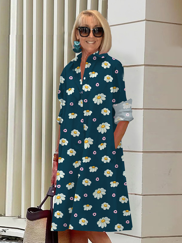 Plus Size Daisy Printed Shirt Dress With Side Pockets
