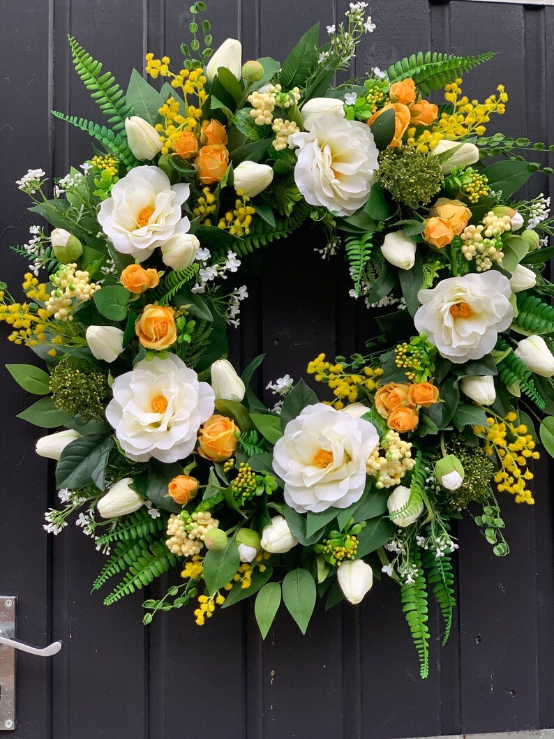 Fabulous luxury handmade spring faux flower door wreath in yellow and white.