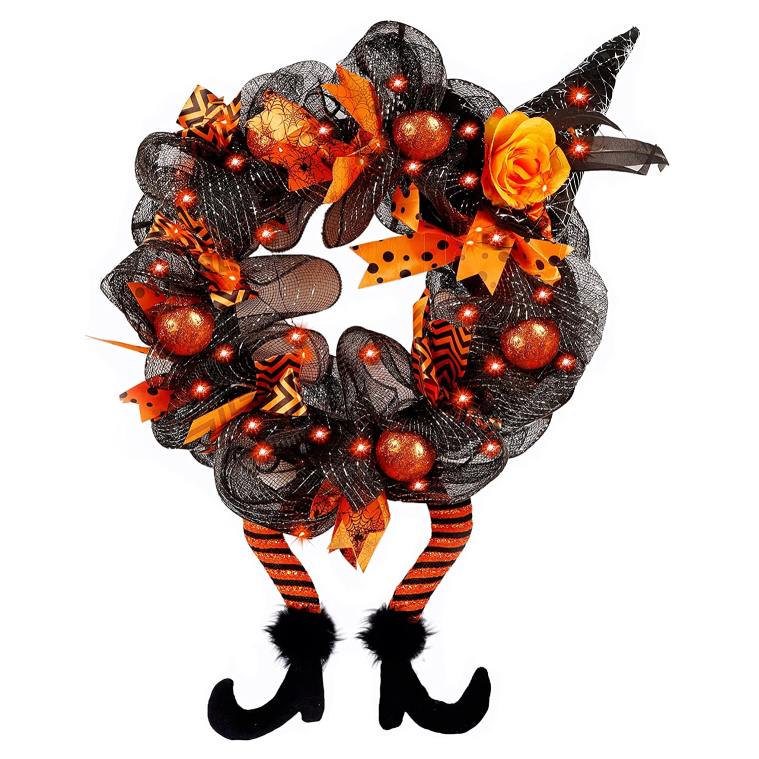 Halloween Decorations Witch Hat and Legs Wreath, Lighted with 30 LED Orange Lights, Front Door Wall Light up Wreath