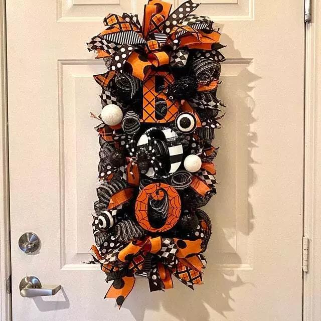 The swag wreath features a spooky BOO with a spider on it. There are several types of mesh and ribbons that together help give that amazing Halloween look. There is a spider on the top. There are several glitter ball picks throughout. It is finished off with 2 gorgeous full bows, one on the top and one on bottom.