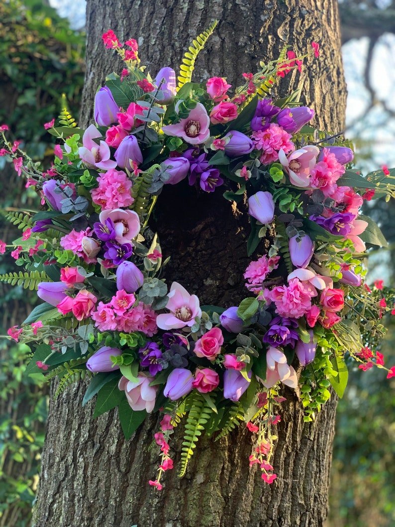 Handmade spring faux flower door wreath in pinks, purples and green.