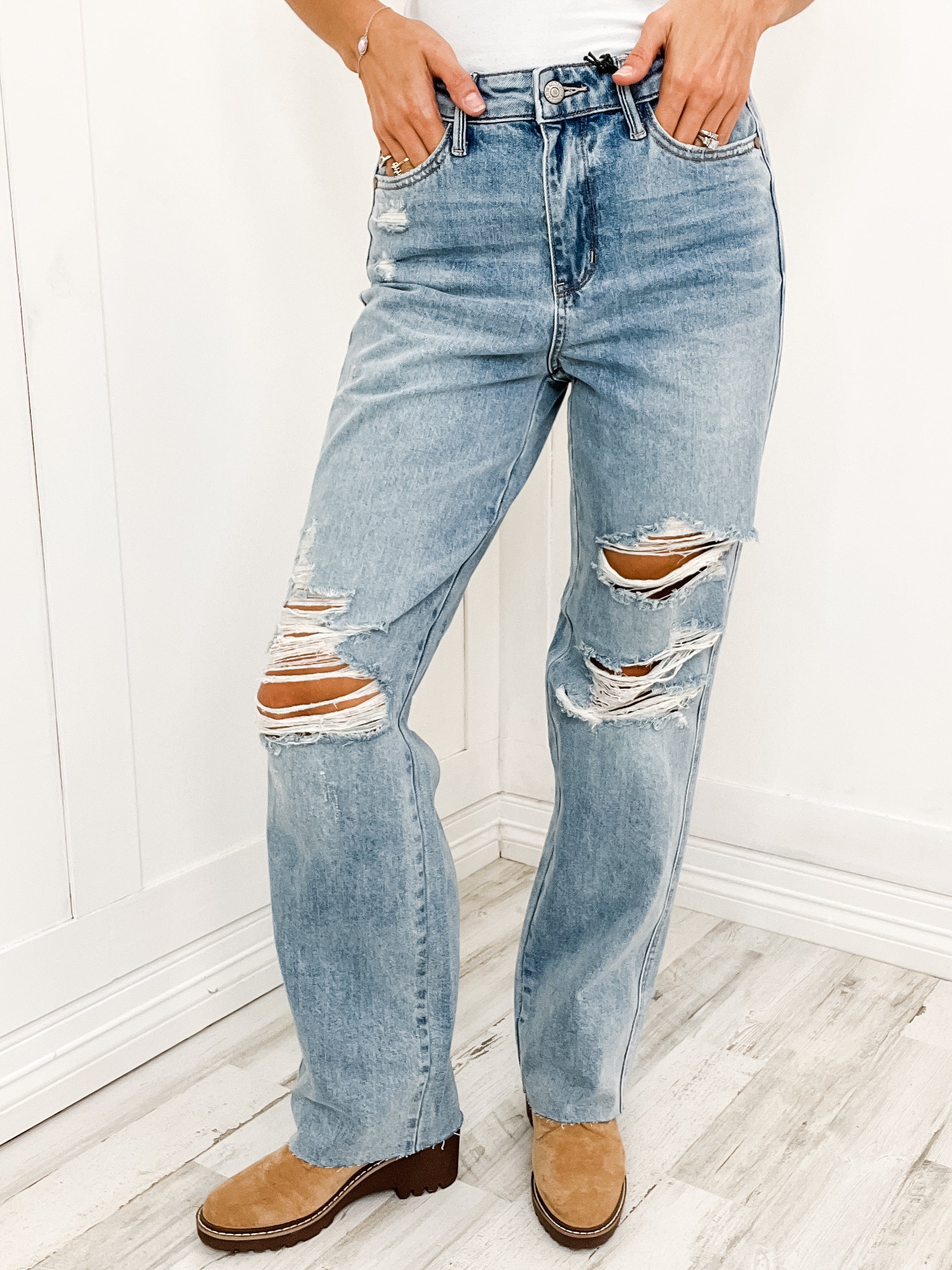 Judy Blue "Gibson" Hi-Rise Rigid Magic 90's Distressed Straight Denim Jeans – a timeless blend of style and comfort. The front panel is crafted from 100% cotton, providing a classic rigid feel, while the back panel combines 94% cotton, 5% poly, and 1% spandex for the perfect mix of flexibility and durability. With an 11-inch front rise and a 32-inch inseam, these jeans offer a flattering fit that channels the effortless cool of the '90s. Elevate your denim game with the Gibson for a look that stands the test of time.