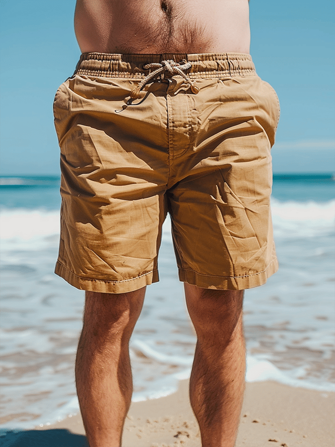 Men's Resort Solid Color Lace-Up Design Casual Pocket Cotton Shorts