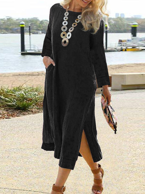 Plus Size Side Split Crew Neck Pocket Long Sleeve Dress