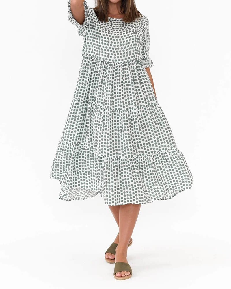Polka Dots Green Lotus Leaf Sleeves Linen Beach Boho Dress