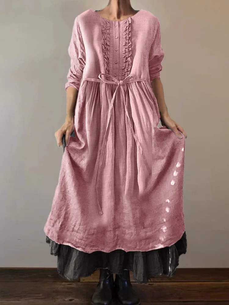 Ruffle Placket Tied Pleated Flowy Maxi Dress
