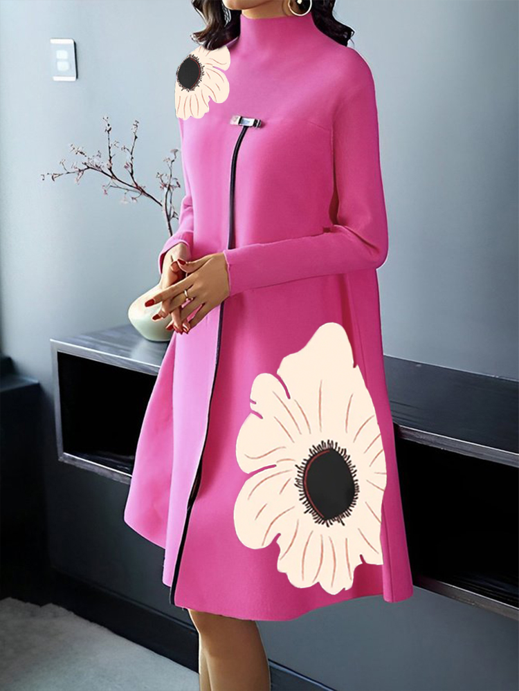 Plus Size Stand Collar High Elasticity Floral Loose Long Sleeve Urban Dress