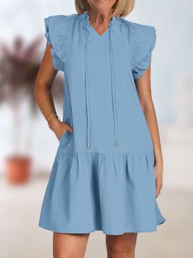 Women's Solid Color V-Neck Ruffle Sleeve Drawstring Dress